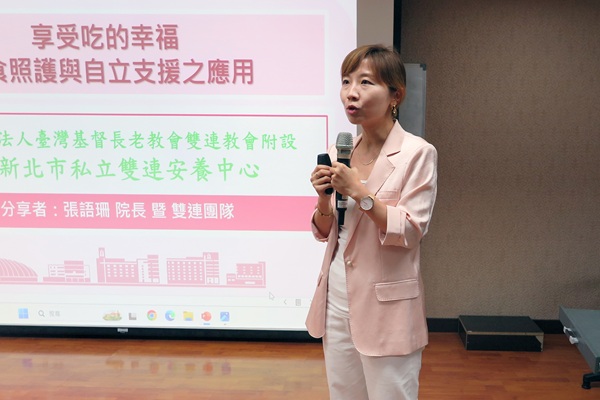 雙連安養中心張語珊院長主講「如何將介護食融入機構自立支援活動」,分享機構導入質地調整飲食的實務經驗與長者復能成效。
