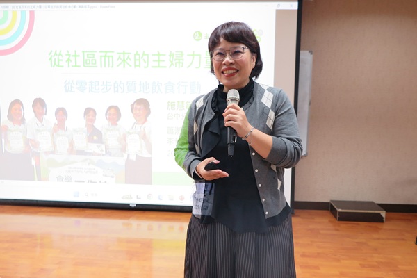 台灣主婦聯盟生活消費合作社台中分社福祉委員會施慧敏副主委主講「從社區而來的主婦力量:從零起步的質地飲食行動」,分享從生活出發,推動社區飲食照護的行動故事。